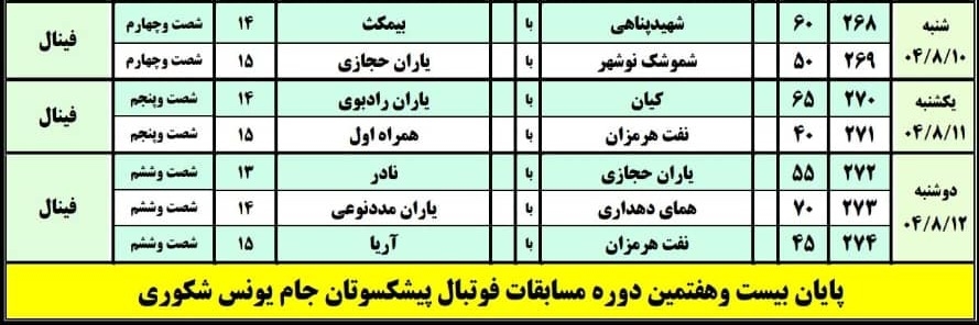 برنامه مسابقات فینال جام یونس شکوری